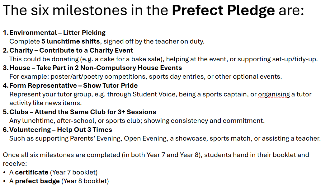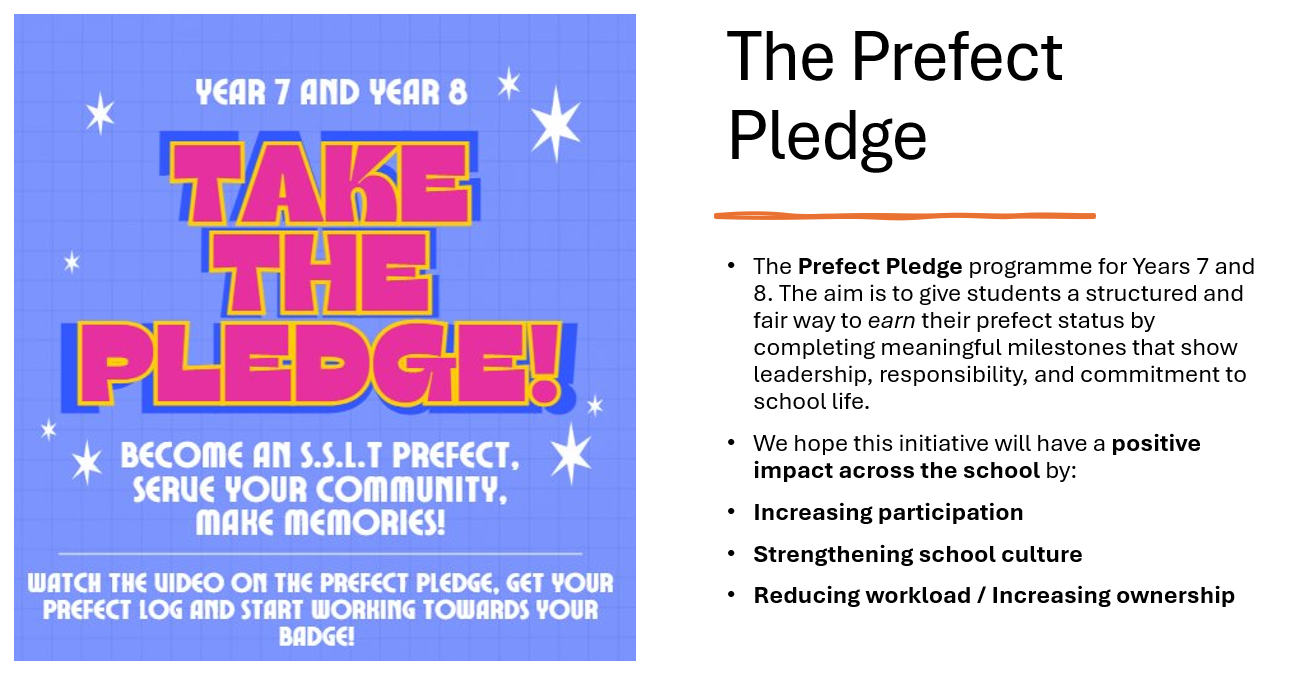 Year 7 and 8 students are welcomed to participate within the prefect pledge system, this is linked to the School Pledge Programme.